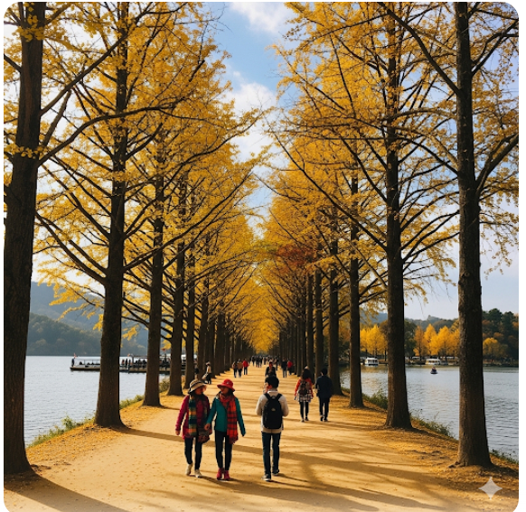 남이섬은 강바람과 어우러진 가을 풍경이 아름다워 연인·가족 단위로 인기 만점입니다.